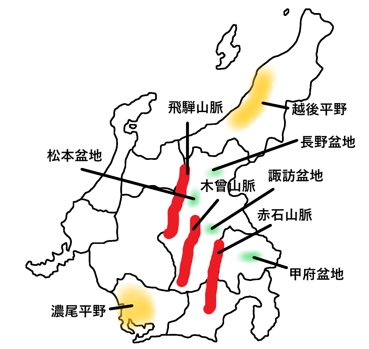 この地域には、長野盆地や松本盆地、諏訪盆地、甲府盆地など多くの盆地があります。