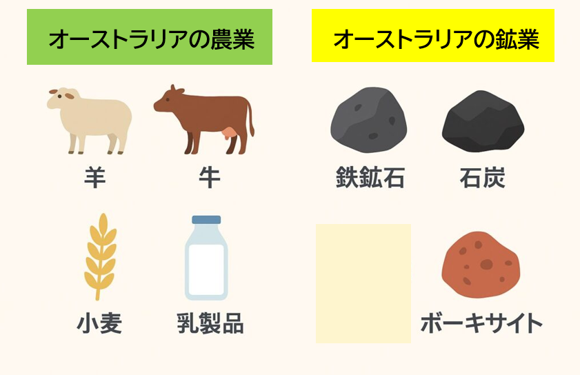 - オーストラリア:羊毛・小麦・牛肉、鉱業(石炭・鉄鉱石・ボーキサイト)