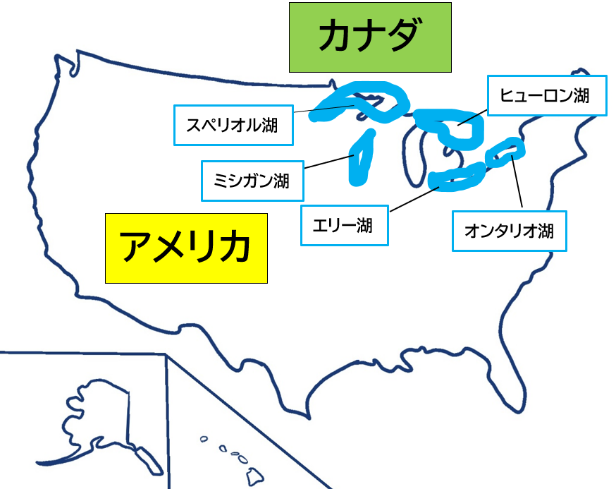 ミシガン湖だけはアメリカ領に完全に含まれるという点がテストの定番です。