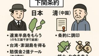 中学生【中学生向け】日清戦争をわかりやすく解説!定期テストによく出る年号・流れ・条約・重要人物まとめ 【中学生向け】日清戦争を初学者にもわかりやすく丁寧に解説!定期テストでよく出る「原因」「1894年の開戦」「下関条約」「三国干渉」などの年号やキーワード、人物や流れまでを図解的にまとめ、効率的に暗記できる構成。テスト対策用の一問一答・記述問題ページへの内部リンク付き! 2025.09.20中学生