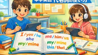 中学英語で学ぶ代名詞をわかりやすくまとめた解説記事です。主格・目的格・所有代名詞・指示代名詞の基本的な使い方を、例文つきでやさしく紹介。日常会話で使える表現も掲載し、例文集や練習問題を通して、文章を短く自然に作るコツが学べます。中1の定期テスト対策や英語の基礎理解に役立ち、代名詞を使う文の作り方を身につけられます。