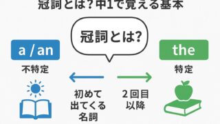 中学英語でよくつまずく冠詞 a・an・the の使い方を、中1向けにわかりやすく解説。意味の違い、a と an のルール、the を使う場面、数えられる名詞との関係、日常シーンの例文、よくある間違い、30問の練習問題まで完全整理。小学生・中学生の基礎固めや定期テスト対策、英語指導者の解説資料としても役立つ内容です。