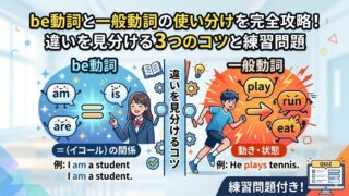 中学生be動詞と一般動詞の使い分け【完全版】一発で見分ける3つのコツ+問題演習(中学英語) be動詞と一般動詞の使い分けを中学生向けにわかりやすく解説。「=か動きか」で一発判定するコツ、疑問文・否定文・三単現のポイントを比較表で整理。穴埋め・並び替え・英作文の演習と現役塾講師の解説で、定期テスト・高校入試対策まで完全対応。短時間で理解し、確実に得点できる力を身につけます。 2023.05.22中学生